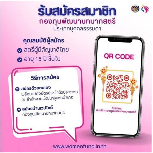 สพอ.นครไทย ขอประชาสัมพันธ์ เชิญชวนการรับสมัครสมาชิกกองทุนพัฒนาบทบาทสตรี ประเภทบุคคลธรรมดาโดยสตรีผู้มีสัญชาติไทย และมีอายุ 15 ปีบริบูรณ์ขึ้นไป สามารถสมัครได้ที่สำนักงานพัฒนาชุมชนอำเภอนครไทย ที่ว่าการอำเภอนครไทย ชั้น 1 หรือสมัครด้วยตนเอง ผ่านเว็บไซด์ กองทุนพัฒนาบทบาทสตรี https://twfreg.cdd.go.th/RegisterMembership